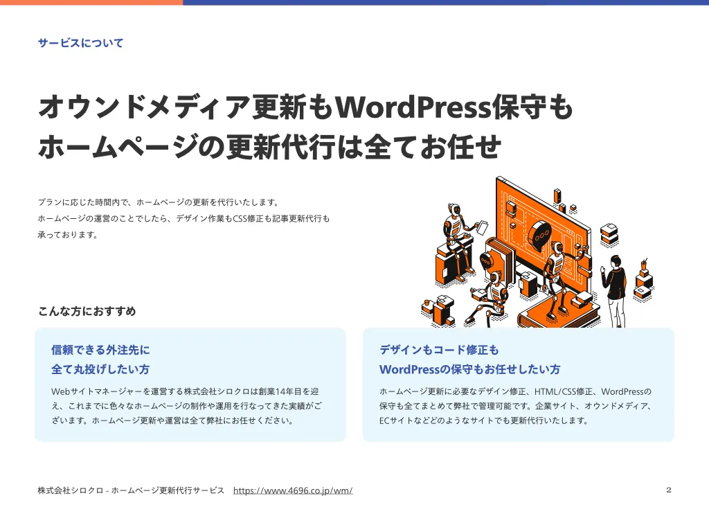 弊社の提供するサービスについて内容や特長を分かりやすくまとめた資料を無料でご覧いただけます。サービスの概要や支援内容を把握するための資料としてご活用ください。ホームページ更新代行サービス資料ホームページ更新代行サービスの資料です。サービスの詳細と事例が掲載されています。